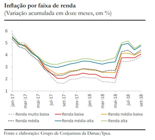 No acumulado de 2018, a trajetória da inflação manteve-se mais amena para as famílias mais pobres (3,0%), em comparação com os segmentos de renda mais alta (3,6%). Nos últimos 12 meses encerrados em setembro, as taxas de inflação apresentaram aceleração em todas as faixas.