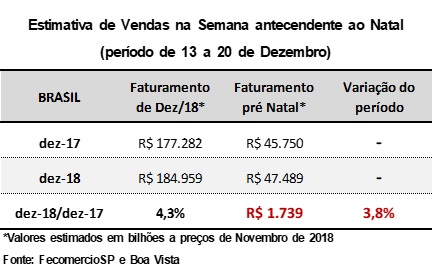 As compras de fim de ano aumentam e continuam impulsionando os bons resultados do varejo brasileiro. De acordo com as estimativas da Federação do Comércio de Bens, Serviços e Turismo do Estado de São Paulo (FecomercioSP), as vendas do setor em todo o País, entre os dias 13 e 20 de dezembro, semana que antecede o Natal, cresceram 3,8%, R$ 1,7 bilhão a mais, em comparação com o mesmo período de 2017. Os cálculos foram feitos com base em dados da Boa Vista SCPC (Serviço Central de Proteção ao Crédito). Considerando todo o mês de dezembro, o faturamento deve atingir R$ 185 bilhões, aumento de R$ 7,7 bilhões, 4,3% a mais em relação a dezembro do ano anterior.