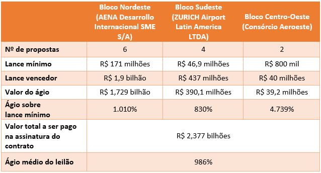 O Bloco Nordeste, formado pelos aeroportos de Recife/PE, Maceió/AL, João Pessoa/PB, Aracaju/SE, Campina Grande/PB e Juazeiro do Norte/CE, foi arrematado pela AENA Desarrollo Internacional SME S/A por R$ 1,9 bilhão, com ágio de 1.010% em relação ao lance mínimo inicial (R$ 171 milhões).
