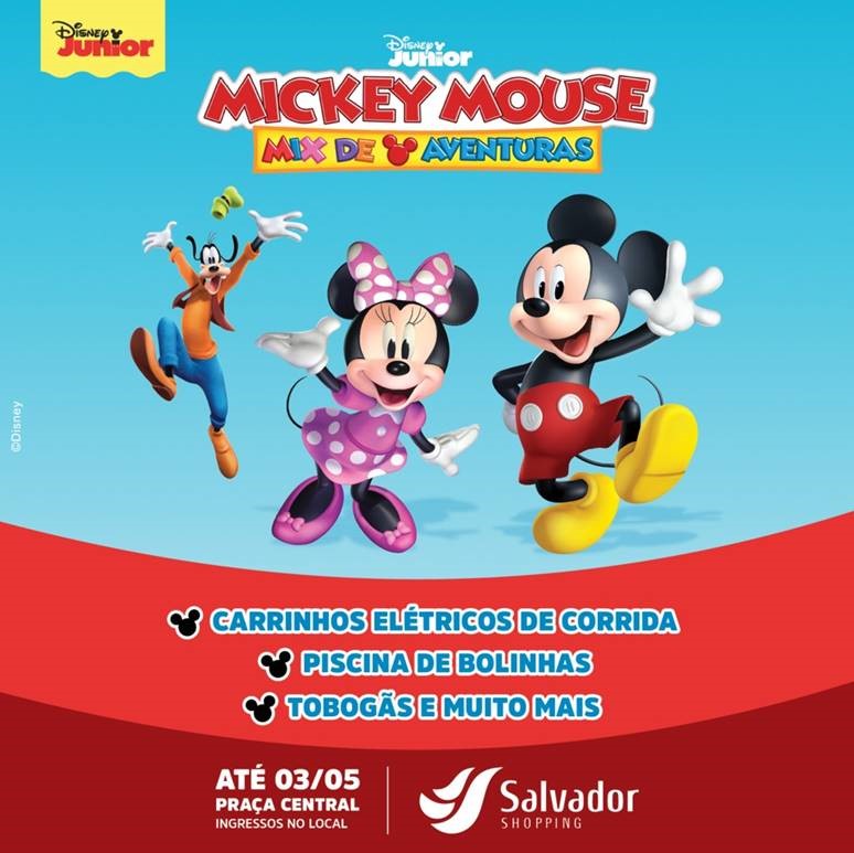 O circuito inspirado na série do canal Disney Junior ‘Mickey Mouse – Mix de Aventuras’ desembarca esta semana na capital baiana. O público infantil vai curte a atração inédita e tematizada com o personagem mais icônico da Disney no Salvador Shopping. No evento, montado na Praça Central – Piso L1, a criançada se diverte no circuito de corrida de carrinhos, dois tobogãs de 4 metros de altura, labirinto vertical e o escorregador de pneu. Os clientes podem curtir a ativação até 03 de maio e os ingressos são vendidos no local ou através das plataformas digitais do Ingresso Rápido. Mais informações: www.salvadorshopping.com.br.