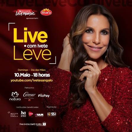 Intitulada “Live Leve com Ivete Sangalo”, a live acontece neste domingo (10), às 18 horas, com transmissão ao vivo pelo canal da cantora no YouTube. Com 30 músicas no setlist, Ivete promete agitar e emocionar os fãs nesse Dia das Mães. Em sua primeira apresentação nesse formato, no último dia 25 de abril, ela apareceu de pijama rosa de bolinhas, na cozinha de sua casa. Acompanhada do marido, Daniel Cady, de Marcelo, seu filho mais velho, e de uma plateia composta por bonecos e brinquedos das crianças, ela fez um show superanimado e se tornou um dos assuntos mais comentados das redes sociais.