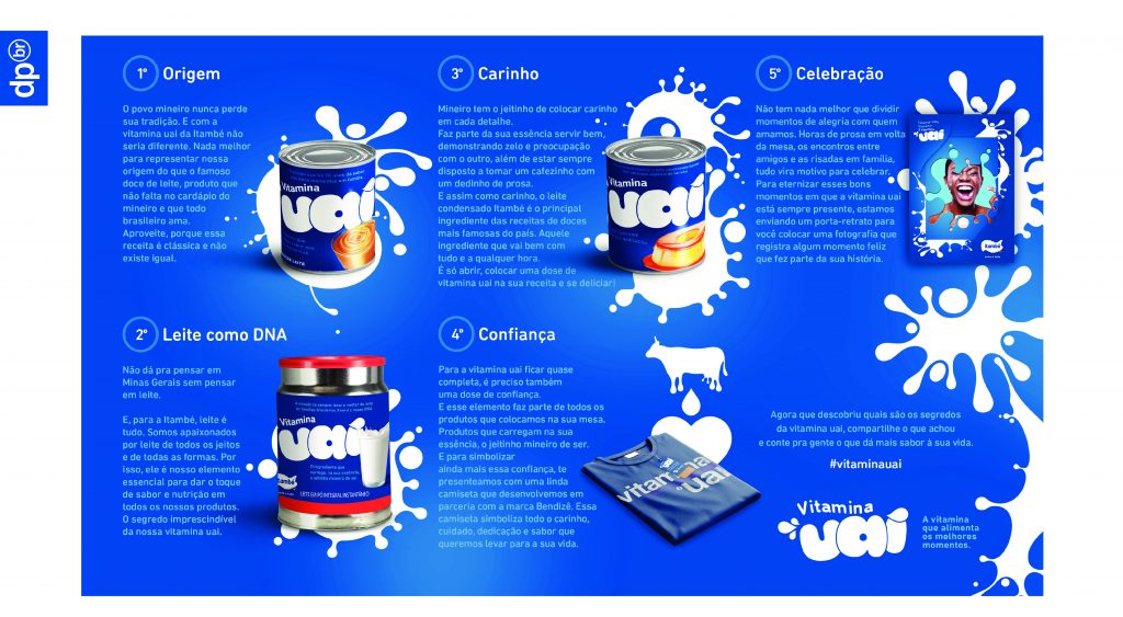 A Itambé, uma das marcas de lácteos mais consumidas e admiradas do país, lança nesta semana, em um jogo show, sua nova campanha ‘vitamina uai’ que vem reforçar o segredo de sucesso, sabor e qualidade dos seus mais de 160 produtos e mais de 70 anos de tradição e história. ‘Vitamina uai’ foi criada para exaltar o carinho e a dedicação que a empresa coloca em tudo que faz e para materializar conceitos já trabalhados no posicionamento da marca, como a Origem mineira, Leite como DNA, Carinho e Confiança e um novo olhar sobre a importância de Celebrar todos os momentos da vida ao lado das pessoas que a gente ama.