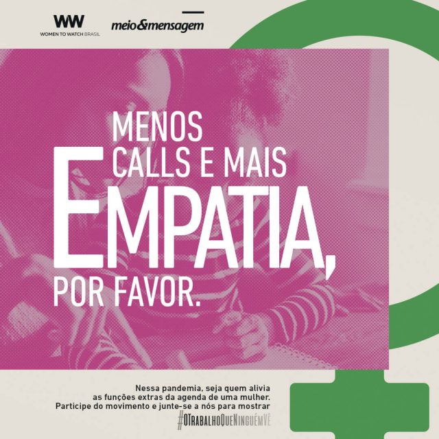 Por isso, o Women to Watch e o Meio&Mensagem, lançam campanha #OTrabalhoQueNinguémVê, que conta com posts nas redes sociais, mídia display, anúncios e ação com grandes executivas para trazer a reflexão à tona e falar sobre o movimento por todo o mês de março, jogando uma luz sobre o #TrabalhoQueNinguémVê. A Lew’Lara\TBWA assina criação e estratégia da campanha.