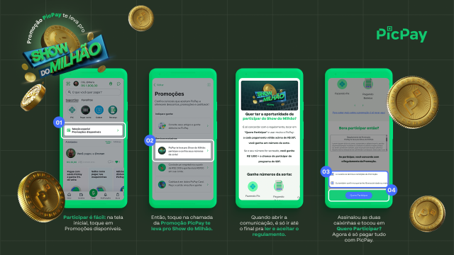 Os sorteios dos números vão ser realizados pela Caixa Econômica Federal a cada 15 dias. O primeiro vai acontecer no dia 14 de agosto. Serão 48 participantes por sorteio – 12 para cada episódio semanal. Para ser usuário PicPay e participar de um dos maiores programas da TV brasileira, é necessário baixar o aplicativo, criar uma conta de forma gratuita e segura e aceitar os termos e regulamento da promoção.