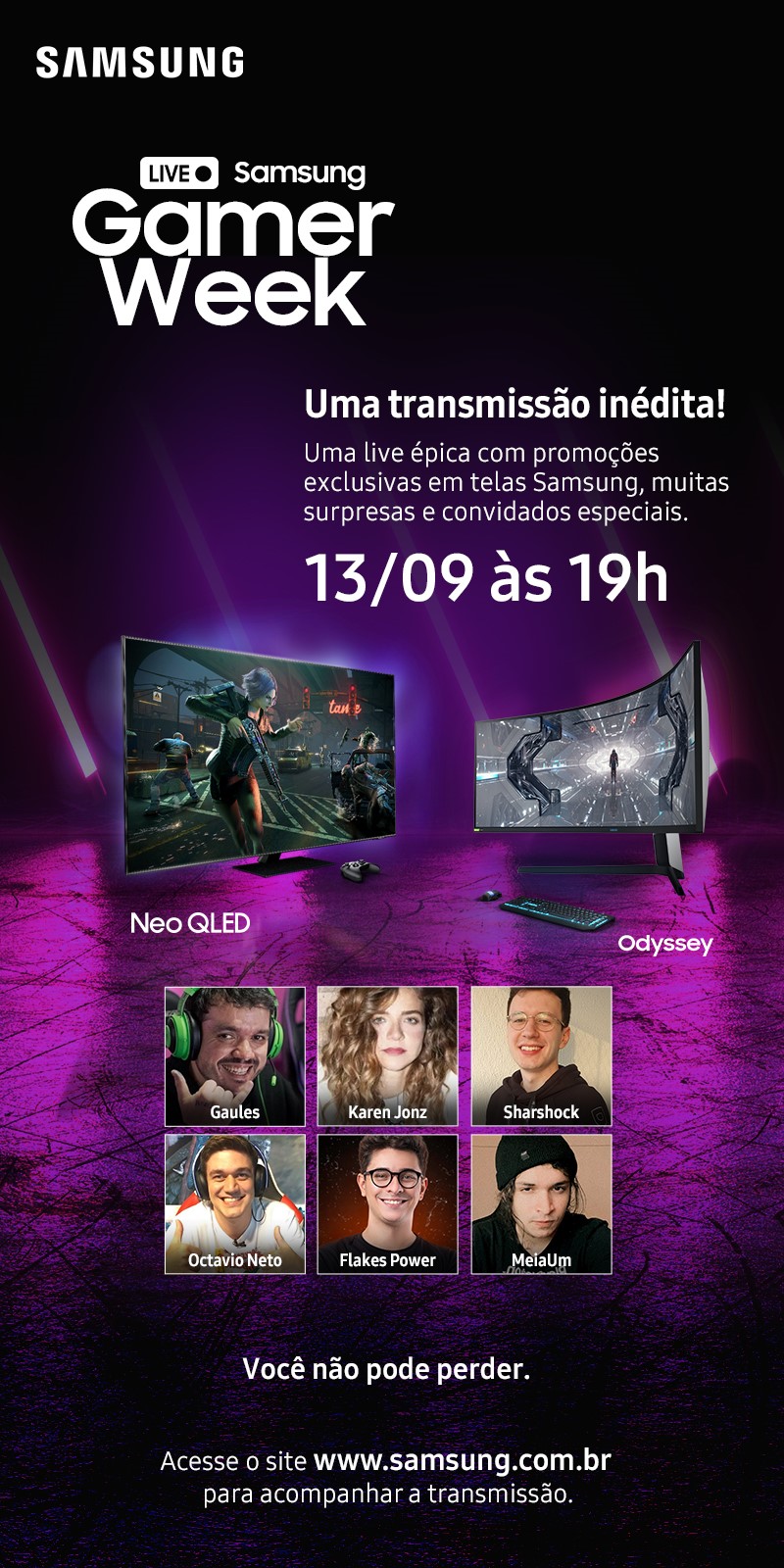 No dia 13 de setembro, às 19h, acontece a Live Gamer Week, que inaugura uma semana de ofertas exclusivas em telas Samsung dedicada aos apaixonados pelo universo dos games. Apresentada por Octavio Neto, a live terá convidados especiais como Karen Jonz, Sharshock, Gaules, Flakes Power e MeiaUm em interações e gameplays ao vivo. Conteúdos exclusivos serão uma atração à parte, com codiguins para jogos, ofertas e muitos detalhes e novidades sobre as linhas de TVs Neo QLED e monitores Odyssey – tudo para quem quer jogar no Neo Level. Para conferir a Live na data, é só acessar Samsung.com.br.