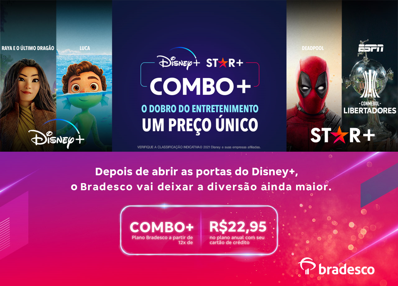 Uma parceria entre o Bradesco e a Disney permite aos clientes dos cartões Bradesco ganhar até seis meses de presente na assinatura do Combo+, pacote mensal de streaming da Disney+ e do Star+ que oferece ao assinante acesso aos filmes e séries da Marvel, Star Wars, Pixar, Disney e National Geographic, além dos maiores torneios esportivos do mundo com a ESPN.