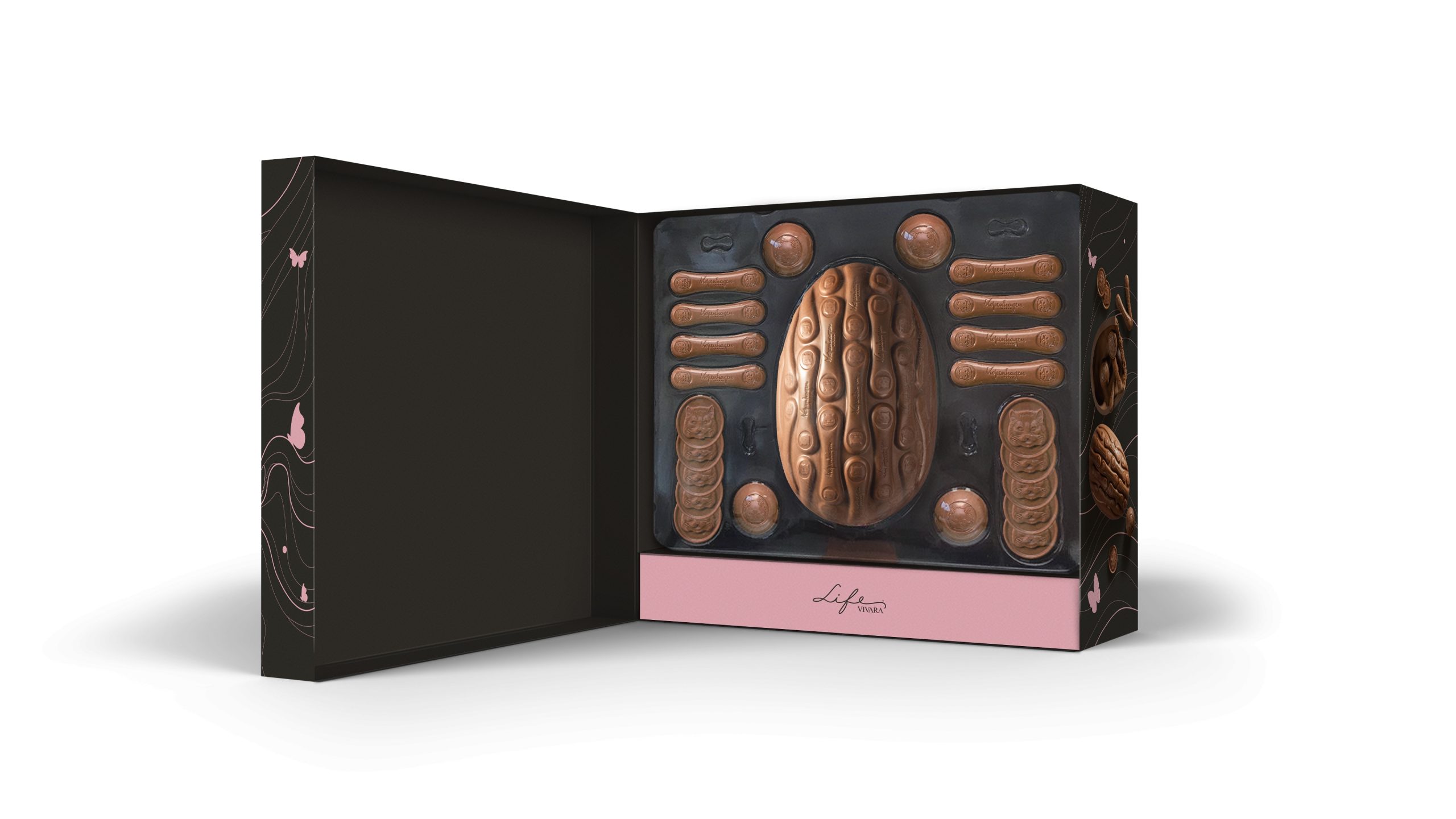 Em uma embalagem cheia de luxo, a Kopenhagen se une à Life By Vivara. São 810g distribuídas em uma sofisticada caixa que contém: 1 Ovo Língua de Gato com casca recheada de chocolate ao leite, 4 trufas de Língua de Gato, 8 medalhões de Língua de Gato, 8 Línguas de Gato de chocolate ao leite e 1 pingente de prata 925 com banho de ouro 18K. (R$ 399,00)
