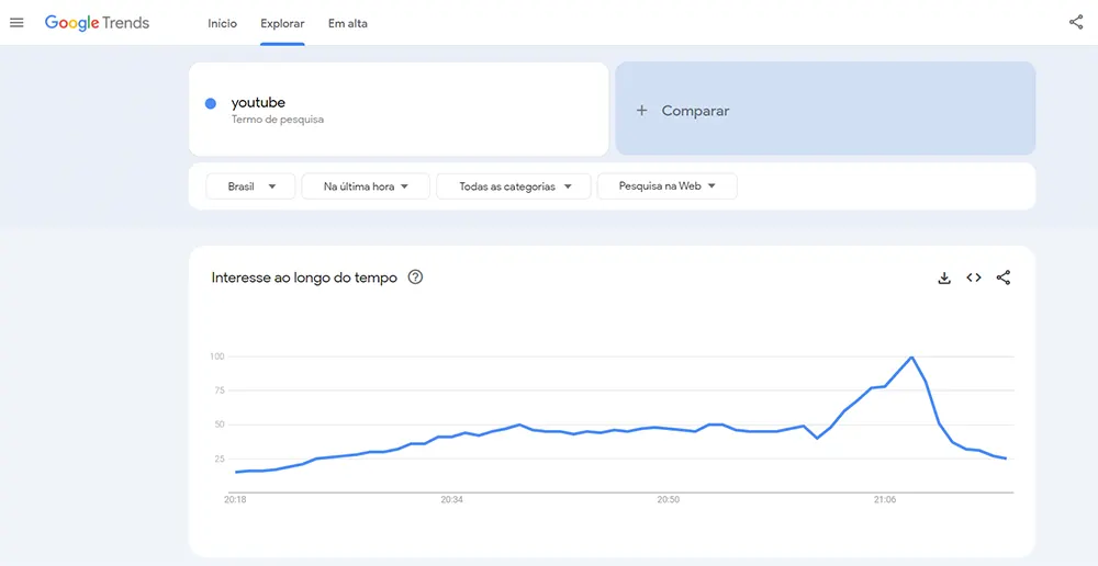 Pelo Google Trends, foi possível observar um aumento significativo nas buscas pelo termo “YouTube” entre 20h e 21h, registrando um pico de interesse às 21h08, momento em que a instabilidade atingiu o maior número de usuários.