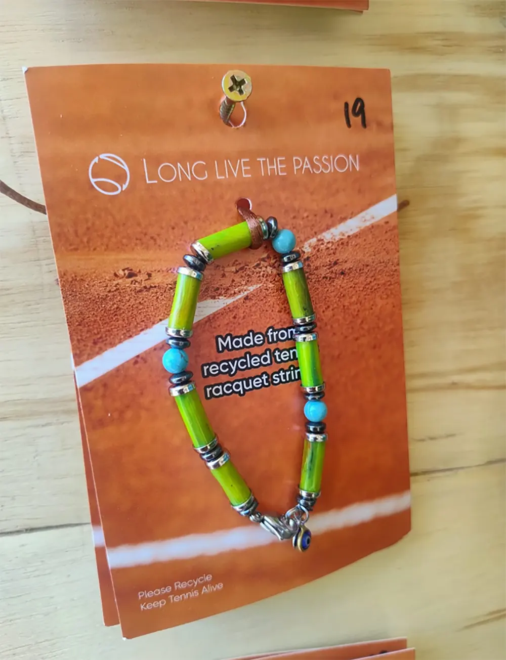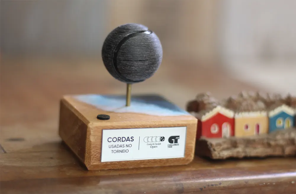 A partir dessa ideia, surgiram souvenires do tênis, como chaveiros, bijuterias, bandejas personalizadas e mini displays colecionáveis com certificados, todos produzidos com cordas de raquete recicladas e saibro.  Cada peça é acompanhada por um conceito que une arte, esporte e consciência ambiental, transformando resíduos em objetos cheios de significado e memória afetiva.